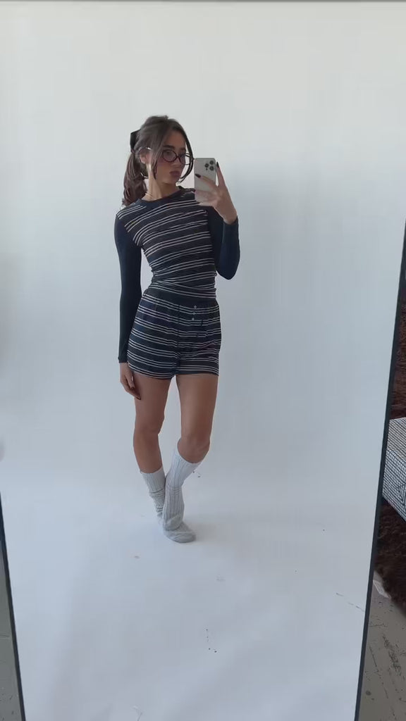 The Long Sleeve Crewneck Top is styled with the Boxer Short.